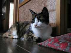 実家のみけさんです。近所のネコと戦ったのか、しっぽがちぎれちゃいましたが・・・