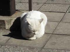 行きつけのスーパーの入り口付近に住み着いている野良の白ネコ君。