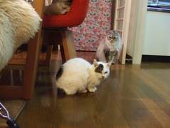 最初の頃(8ヶ月前)は妹猫の居る部屋の前をシャーシャー威嚇しながら小走りに走り去ってましたが、
