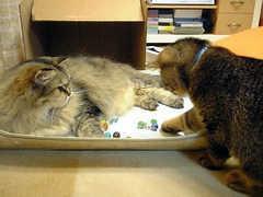 一緒に遊ぶかな?と思い、箱にビー玉を投入。