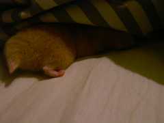 そろそろ起きたら?と布団をめくったら、まだ眠い~と布団の奥へ戻っていきました。無精して後ろ足だけでw