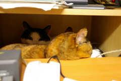 デスクの前に置いてあるカラーボックスの中が近頃の我が家のぬこらの流行。
