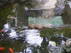 (放し飼いスペース)で撮ったもので、水辺で涼をとるホンドリスです。