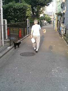 お婆さんとワンちゃんと一緒にお散歩にでかけます。