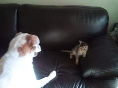 いつもは、私が食べているパンの最後のひとかけらをもらうために座り込みをしているラルが、パンに見向きもせずがんばってます。(ちゃんとひとかけ残しておきました)