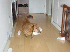 蓮くん、久しぶりに大好きなトイレットペーパーの芯を貰いました。