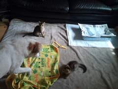 敷物を洗ってみたところ、ラニ、ロナ、子猫たち全員が洗いたての敷物の上でゴロンゴロンするようになりました。においつけオリンピックでしょうか。