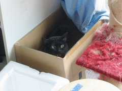 タワー横に出来た謎のスペース(背の高い段ボール箱に発泡箱を仕込んでネコベッドの敷き布団を敷いたもの)に入り込むらっきー。ほんのりフー!風味なのがアレでございますが…