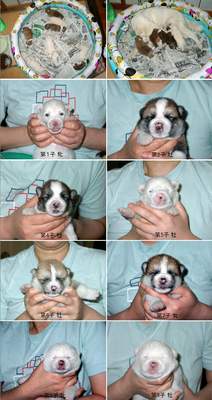 ビニルプールの中でおとなしく眠っております。プール右下の白の仔が第1子、茶の仔が第4子です。他の仔に比べ小さいので識別が出来ます。上部にいる茶の仔は第6子です。毛の模様が他の仔と違うので識別出来ます。他の仔は、ひっくり返して雌雄の別とマジックインキの印で識別しております。