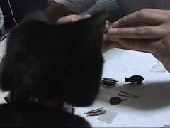 グリコのおまけ「七輪とさんま」を凝視する我が家のジェイ君の後ろ頭。
