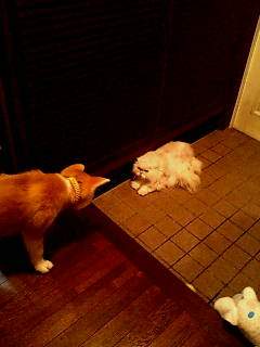先日は、ボールやペットボトルや犬用ガムを目の前に並べて、『遊ぼっ!!!』とやっていました。