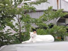 「乗合タクシーの上で寝る猫」
