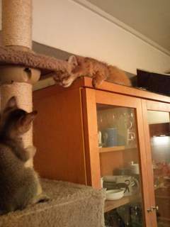 キャットタワーにのぼったら、先にラニがいたのでうろたえています。
