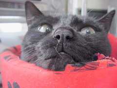 何か生首みたいに見えますが…単にネコベッドの縁にアゴをのっけてるだけです。