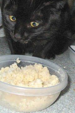 ごはんに本当の「ごはん」(ササミふりかけつき)を出されて困惑するらっきー。