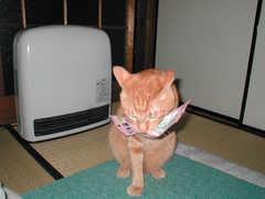 からっぽ猫ジャーキーの袋をくわえて暴れるの図