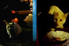 寒い夜なのに、青色のゴミ箱近辺でご飯を探していた、白いろに茶色のブチの子猫っぽい
