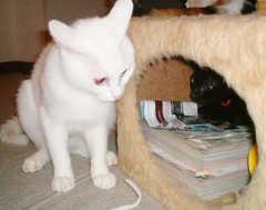 黒猫(ごんた)を追いつめてる白猫パンニャ